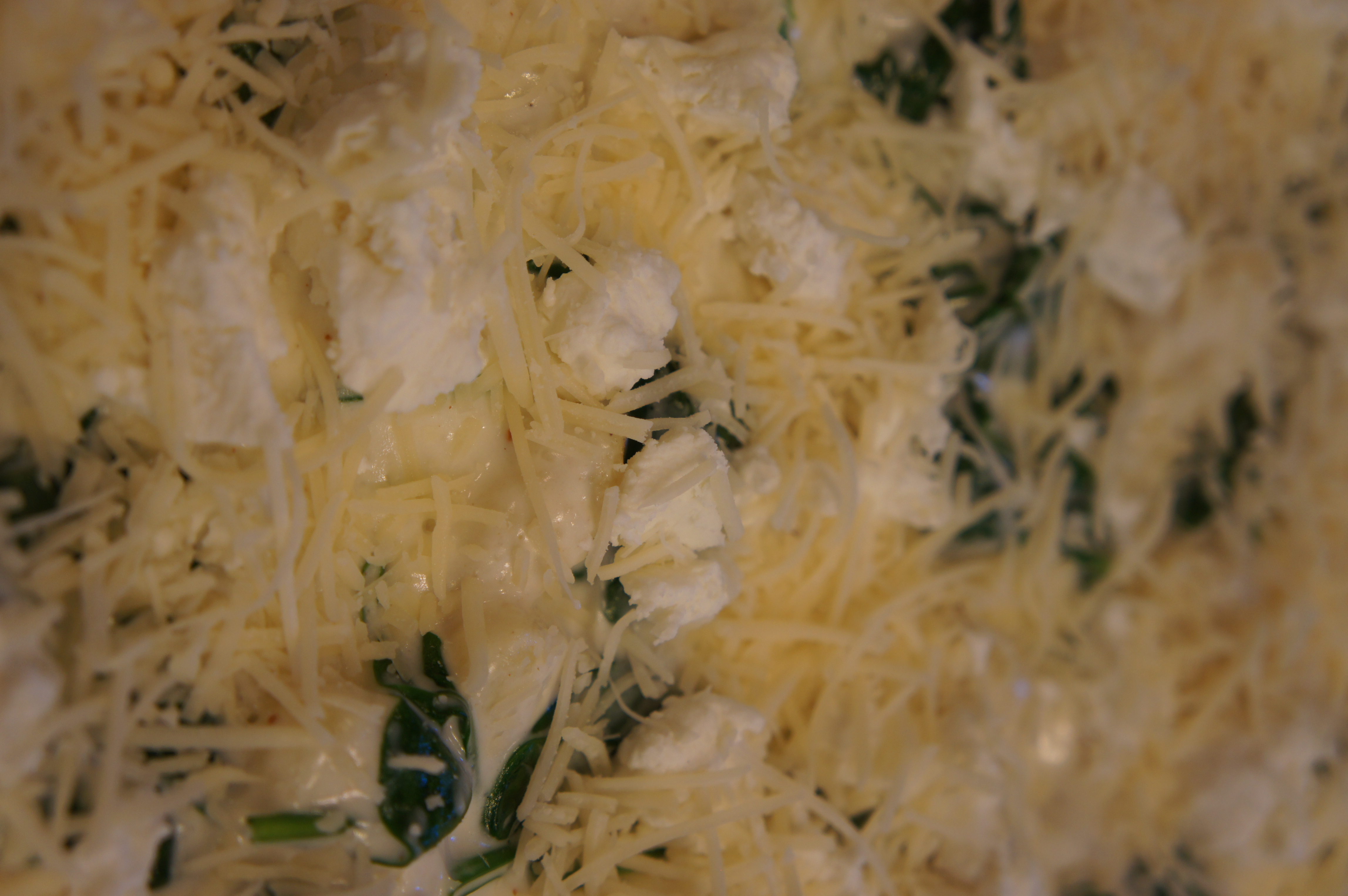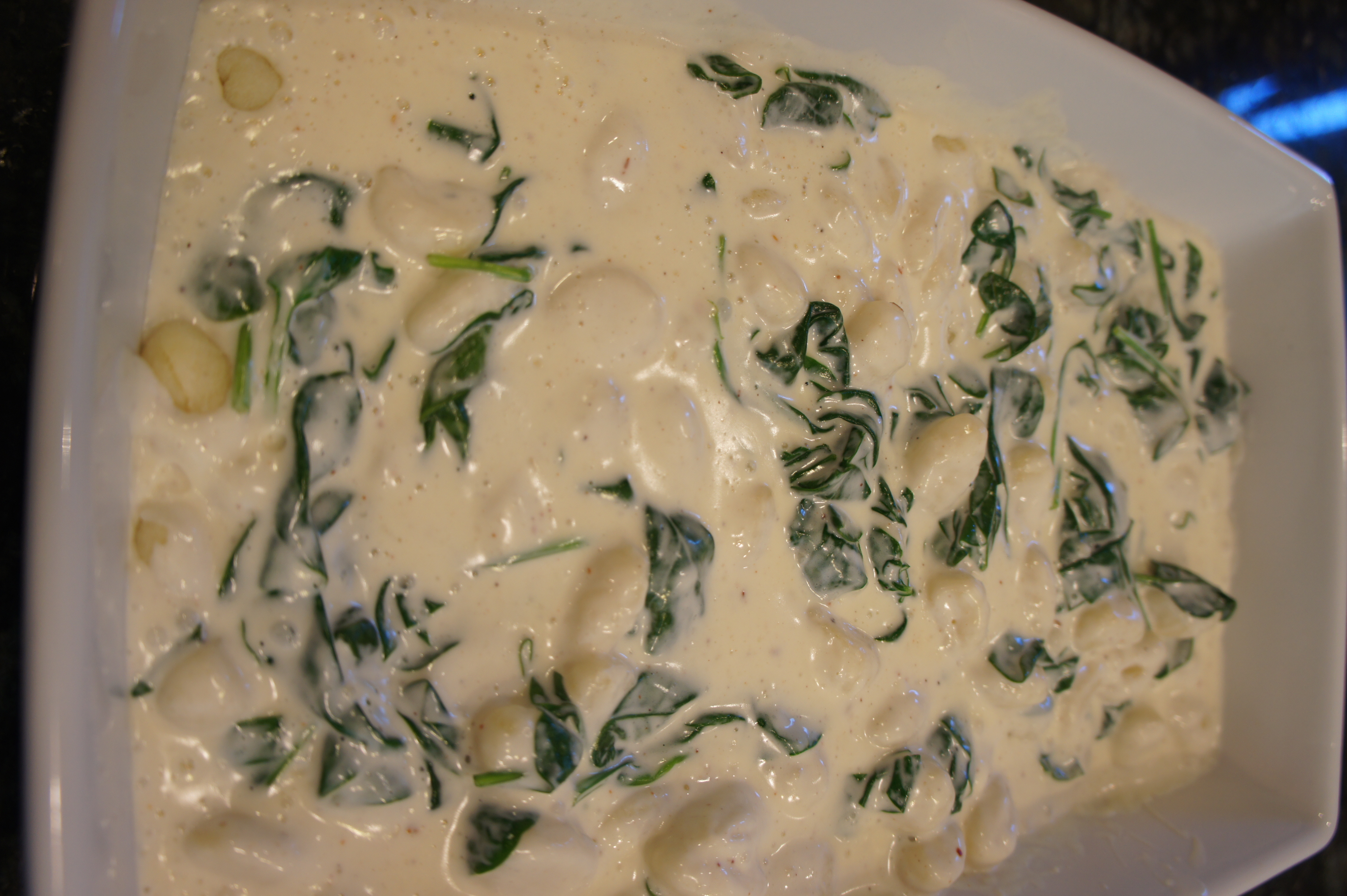 7. Pour the sauce and spinach mixture over the gnocchi evenly, spreading the spinach out to cover all the gnocchi.