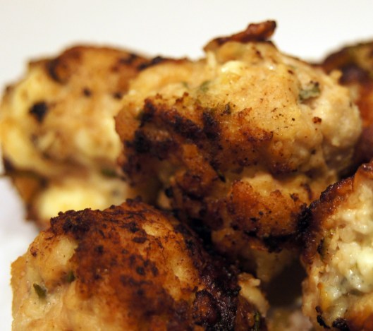 Yeah… I have heard the joke before…” Chickens have balls?” … ummm really? Not very funny. This is a recipe perfect for any occasion and they are”manly” enough to serve on Super Bowl Sunday. Plus kids love them. They are amazing hot because the gorgonzola cheese oozes with every bite. They are quite tasty the next day cold by themselves or in a wrap with fresh greens. If you don’t want bite sized chicken “balls” you can make these in to sliders or larger burgers. Serve them on a toasted ciabatta bun with caramelized onions. The pictures don’t do these justice!