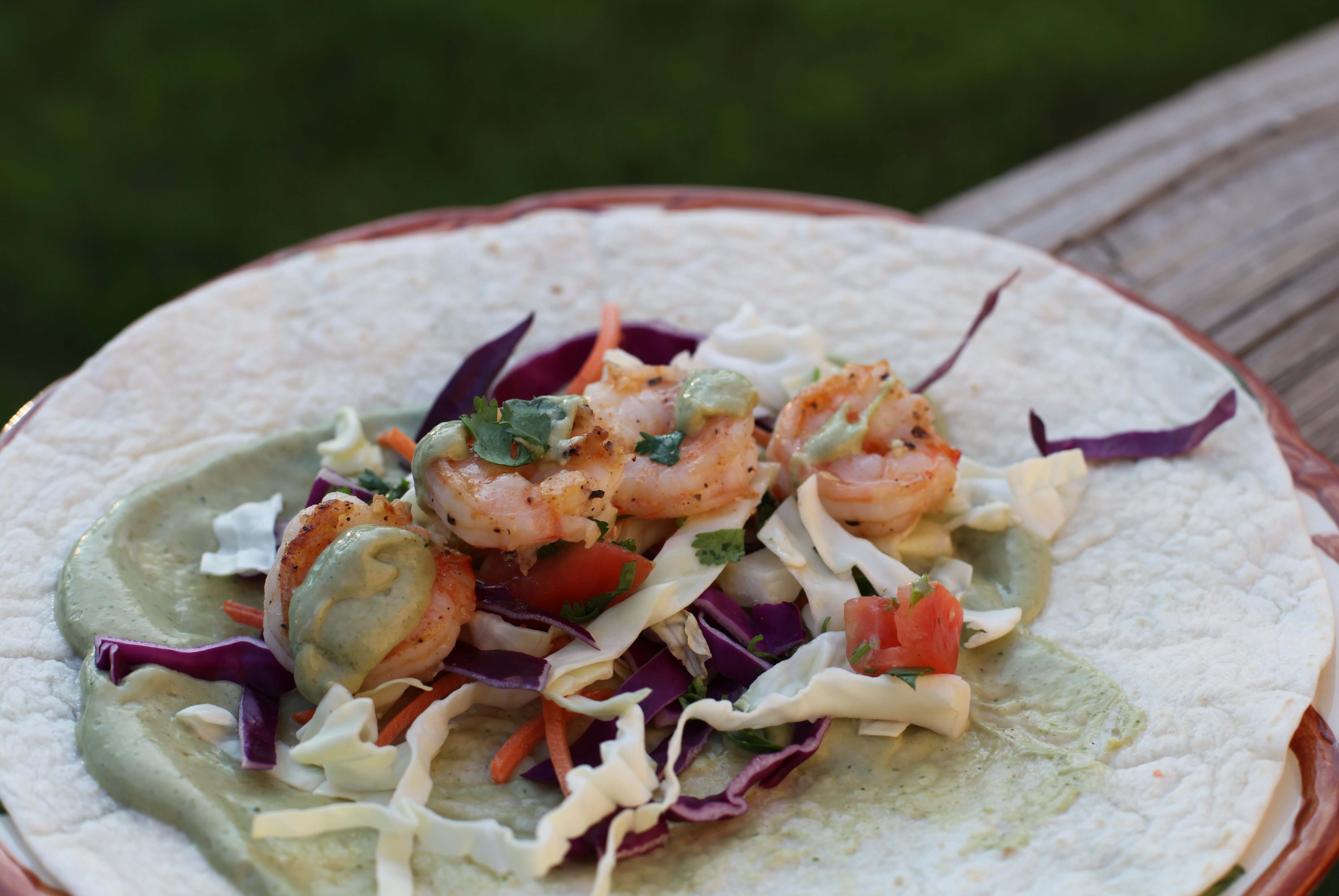 I am dreaming of warm weather…. Can you tell? I cant wait for it to be warm enough to cook outside again with out having to put on layers of clothing. In the spring and summer I am pretty much obsessed with making any type of fish taco. The combinations are endless as are the sauces and condiments. This was just simply thrown together using the same avocado chipolte sauce from my mahi mahi tacos which for some reason is the most viewed post on my blog almost daily. For this taco I  marinated some shrimp in lime juice, garlic, salt, pepper and olive oil for about a half hour. I then grilled the shrimp.  To load the taco, I spread the avocado chopolte sauce on a soft taco, layered on some premade cabbage slaw, tomatoes, cilantro, shrimp and more sauce.  Yum…….