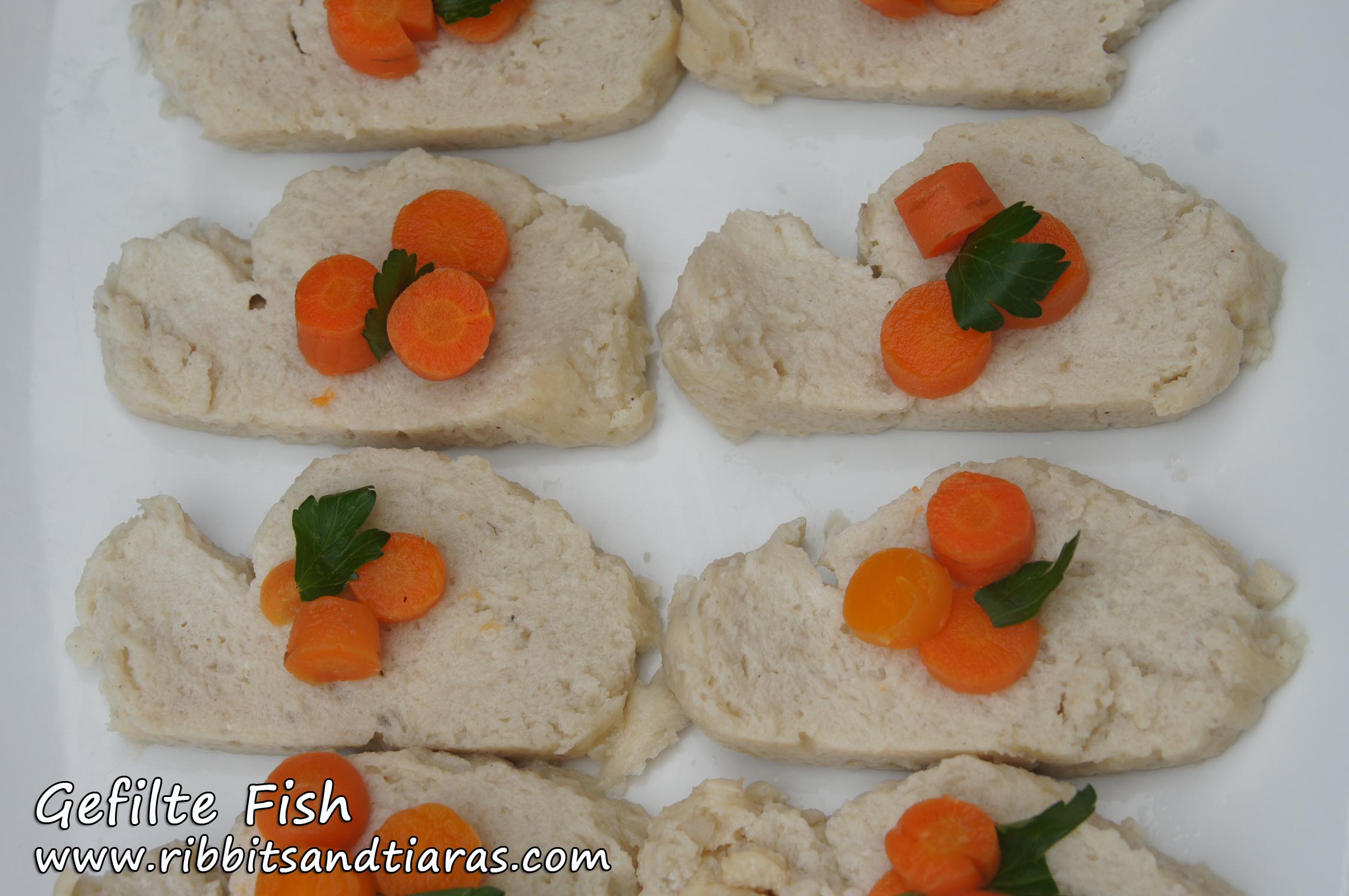 Gefilte fish. Is essentially poached fish. The word gefilte was derived from the german word stuffed. At one time the fish mixture was at one time stuffed into the skin of the whole fish – hence “stuffed” You either like gefilte fish or hate it. There is no in between. I know that I can not eat it from the jar because the jelly substance is just plain gross. My mom often made her own and I love the tales of our grandparents and the carp in the bath tub!