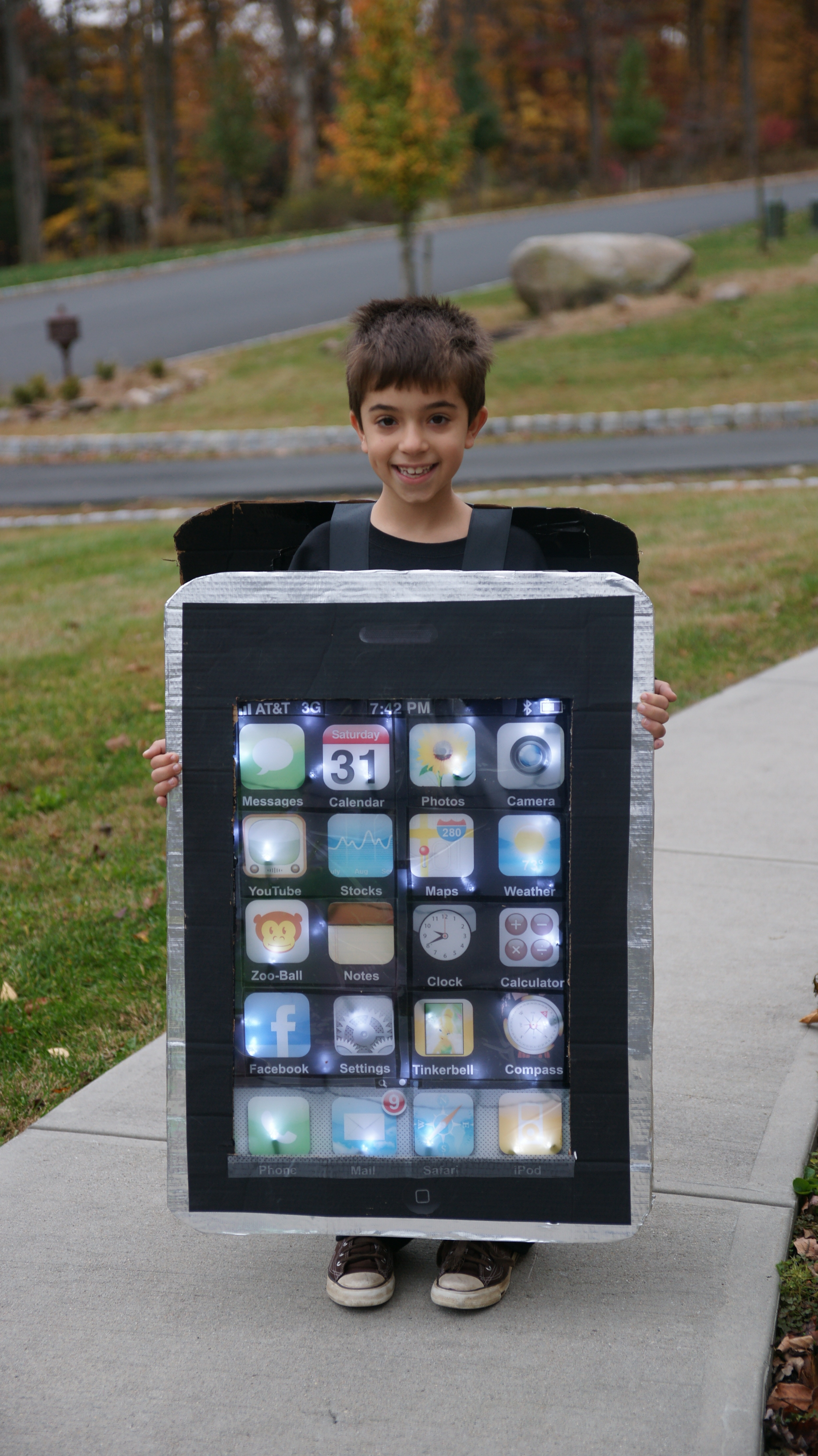 In 2009 I was two years in to making Halloween costumes for my kids. In 2007 our family went as a family of Starbucks Cups + Barista and in 2008 we were Sushi Rolls, A Sushi Chef and a Kikkoman Soy Sauce packet. I thought the pressure was on in 2008, but in 2009 my son asked to be an iphone. At first I was a bit conflicted…. I do work for a competitor….. but he REALLY wanted to be an iphone. So I went to work sketching, cutting and “photoshopping” THEN my son threw me a curve ball. ” Don’t forget it has to light up!!!” How was I going to do that? Well for the first time EVER I was thankful for the stores having Christmas decorations out before Halloween was even over! I snatched up a few battery operated LED lights!