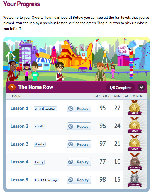 Speed is calculated by Words Per Minute (WPM) and Accuracy is the % correct. At the end of each lesson, QwertyTown assesses how quickly and accurately students can type with the keys they’ve learned. Students may earn Bronze, Silver, or Gold Medals, as their learning progresses.